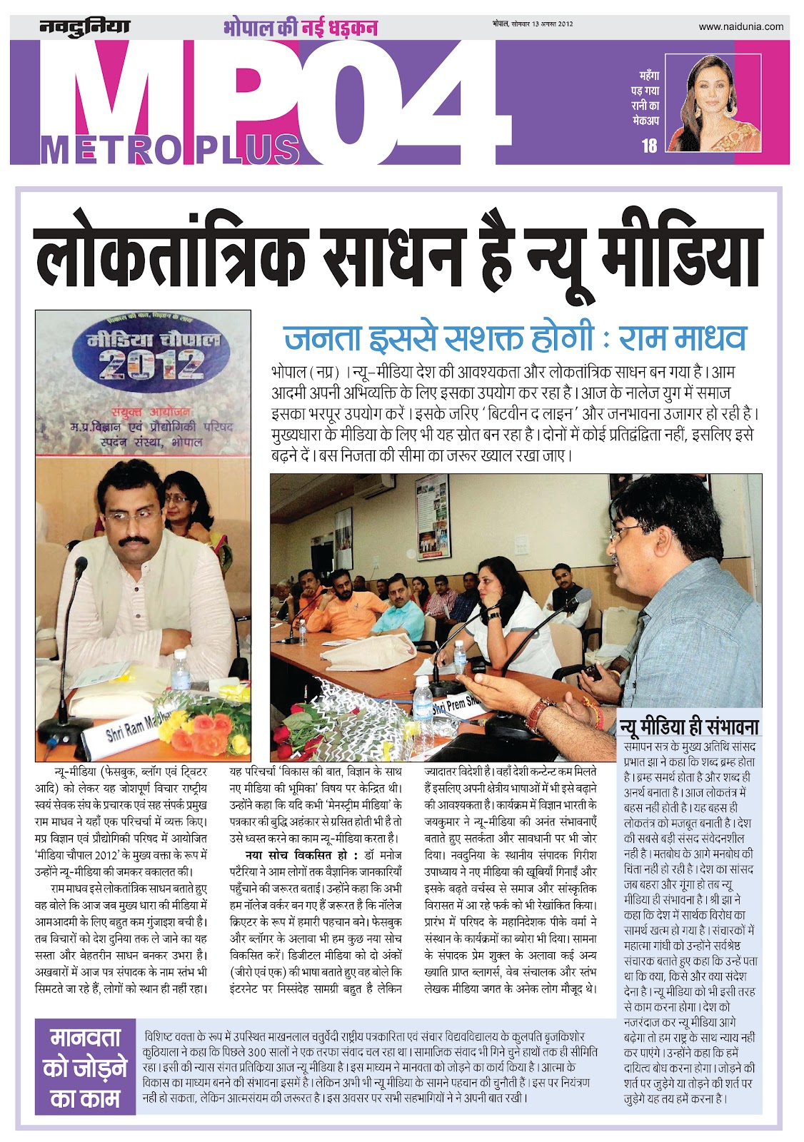 मुझे सबसे ज्यादा प्रभावित किया राष्ट्रीय स्वयंसेवक संघ के अ. भा. सह सम्पर्क प्रमुख राम माधव जी के विचारों ने. जिन्होंने न्यू मीडिया को मीडिया का लोकतांत्रिककरण बताया.उन्होंने कहा कि न्यू मीडिया अभिव्यक्ति की आजादी का एक सर्वोत्तम माध्यम है.उन्होंने इसे किसी भी दायरे में समेटने पर असहमति जताई उनका कहना था कि, यह माध्यम आम इंसान का है और अब वह अपनी बात कहना सीख गया है.