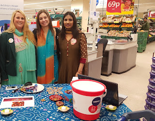 आज सुबह राशन खरीदने टेस्को (सुपर स्टोर) गई तो वहां का माहौल कुछ बदला बदला लग रहा था. घुसते ही एक स्टाफ की युवती दिखी जो भारतीय वेश भूषा में सजी हुई थी. मुझे लगा हो सकता है इसका जन्मदिन होगा। सामान्यत: यहाँ एशियाई तबकों में अपने जन्मदिन पर परंपरागत लिबास में काम पर जाने का रिवाज सा है. परन्तु थोड़ा और आगे बढ़ने पर स्टाफ की एक ब्रिटिश महिला भी सलवार कमीज में घूमती हुई मिली। अब मामला कुछ असामान्य लग रहा था. परन्तु ज्यादा हर मामले में अपनी नाक न घुसाते हुए मैंने सामान लिया और काउंटर पर भुगतान करने आ गई. वहां भी एक मोहतरमा पूरी भारतीय साज सज्जा के साथ विराजमान थीं. अब मुझसे रहा नहीं गया तो मैंने पूछ लिया कि आज कुछ खास है क्या ? तब उसने बताया की यहाँ हम दिवाली मना रहे हैं और इसीलिए कुछ खास सजावट और गतिविधियों के साथ ही सभी स्टाफ ने भारतीय वेशभूषा में आने का निर्णय लिया है.सामान्यत: लंदन में सभी समुदायों के त्यौहार काफी खुलेमन से मिलजुल कर मनाये जाते हैं और बाजार को देखते हुए दुकानों में दिवाली, ईद आदि पर एक कोना उससे सम्बंधित सामान से सजा दिया जाता है पर आज तो छटा ही कुछ और है फिर आज तो दिवाली है भी नहीं। खैर सामान लेकर बाहर निकलने को हुई तो किनारे पर एक मेज सजी हुई दिखी जहाँ दीये, टॉफियां और मेहंदी के कुछ कोन रखे हुए थे अब मुझे फिर जिज्ञासा हुई तो वहां खड़ी एक स्टाफ से फिर पूछ लिया। उसका नाम फाल्गुनी था कुछ ७ साल पहले वह यहाँ आई थी.शायद पढ़ने, और अब पार्ट टाइम टेस्को में काम करती है. फाल्गुनी ने विस्तार से सब बताया और मेरी हथेली पर मेहंदी भी लगाने की इच्छा जताई जो मैंने उसकी एक तस्वीर खींचने के एवज में स्वीकार कर ली.