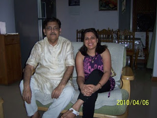 खैर मुंबई में वो २ दिन बहुत ही शानदार गुजरे और उछलते कूदते हम दिल्ली आ पहुंचे , दिल्ली में १० दिन रहने का विचार था और हजारों काम , यही होता है दो नौका में एक साथ सवारी करने का अंजाम …हजारों काम पेंडिंग थे जिन्हें निबटाना था । पर हमारा दिमाग तो लगा था कि क्या जुगत लगाई जाये कि कुछ करीबी मित्रों से मिलने की सूरत निकल आये.पर सुबह से शाम तक चकरघिन्नी की तरह घूमने के चक्कर में अपनी ये योजना हमें खटाई में नजर आ रही थी…बहुत से लोगों से फ़ोन करने का और मिलने का वादा किया हुआ था …पर डर के मारे कॉल भी नहीं की ..कि यदि कॉल किया तो मिलने का और भी मन करेगा और न मिल पाने कि सूरत में कोफ़्त भी बहुत होगी..पर वो कहते हैं न कि इच्छा सच्चे दिल से कि जाये तो सारी कायनात उसे पूरा करने में जुट जाती है ..ऐसा ही कुछ हुआ… किसी जरुरी काम से हमारे पतिदेव को गुडगाँव जाना पड़ा और इस बहाने हम द्वारका में अपने एक रिश्तेदार के यहाँ रुक लिए …बस फिर क्या था .तपाक से किया संगीता दी (स्वरुप )को फ़ोन और झटपट पहुँच गए उनके घर.ये दास्ताँ आप उनके ब्लॉग पर भी पढ़ चुके होंगे और अगर नहीं पढ़ा तो अब पढ़ लीजिये गीत http://geet7553.blogspot.com/2010/04/blog-post_07.html पर।) और जी हमें एक दुसरे को पहचानने में जरा भी मुश्किल नहीं हुई। क्योंकि देखने में भी संगीता जी उतनी ही प्यारी हैं जितनी सुन्दर वो कवितायेँ लिखा करती हैं …हाँ उनकी कविताओं को पढ़कर ये सोचना थोडा मुश्किल हो सकता है कि वो कितनी ज्यादा हंसमुख हैं ,और उनका सेन्स ऑफ़ ह्यूमर कितना जबरदस्त्त है.वैसे इस मामले में मिस्टर स्वरुप ( उनके पतिदेव) भी कुछ कम नहीं ..जितनी देर बैठे फुलझड़ियाँ छोड़ते रहे और हम लपकते रहे.,हमारे ये तरह तरह के पोज बनाकर फोटो भी उन्हीं ने खींचे।